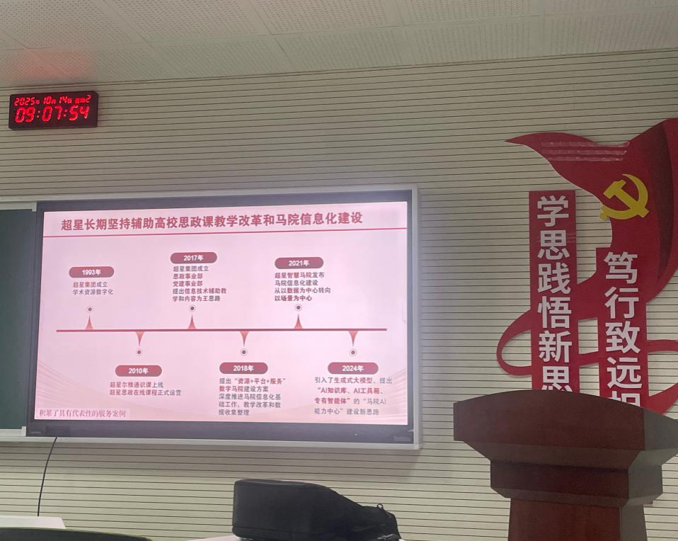 为进一步深化思政课教学改革创新,持续推动信息技术与思政教育深度融合,以AI赋能思政课实践教学,10月14日上午,我院在1009会议室召开了超星培训交流会,共绘智慧课程新图景,共探实践思政新路径。