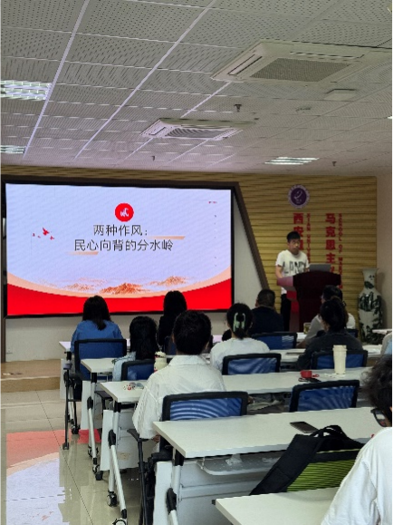 经过前期各学生党支部的广泛动员和严格筛选,共有11位选手脱颖而出,进入决赛。决赛场上,选手们“以小见大”,深入挖掘了党的光辉历程和伟大成就。在选题上,紧扣时政热点和生活实际,如从热门电影《哪吒2》中剖析文化自信的内涵,以柳州螺蛳粉探讨乡村振兴辩证法等,生动诠释了马克思主义理论的时代价值;在表现形式上,选手们充分运用多媒体技术,借助PPT、视频及音乐等,让观众沉浸其中。现场不时响起热烈的掌声,充分展现了学院学生在理论宣讲方面的创新能力和青春活力。