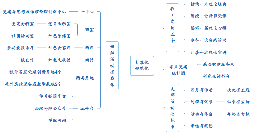自2019年开展党建“双创”以来,学院教工党支部到2021年实现全部入选“样板支部”。学院强化“142223”党建载体建设,制定党支部“七个有”“五个一”标准,院党委副书记、副院长分别担任学生党建类社团指导教师,打造“三强五引铸魂育人”学院党建品牌、“七三五一”教师党支部党建品牌和“小马拉车”学生党建品牌。