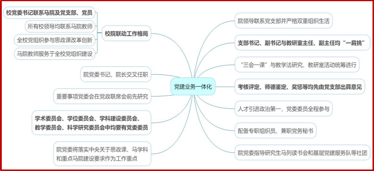 学院推进党建业务一体化发展机制。院党委委员分别入选学院学术、学位、学科建设、教学委员会,党支部书记、副书记兼任教研室主任、副主任,实现党建与教学永利集团同部署、同落实、同考核,切实把全面加强党的领导落到实处。