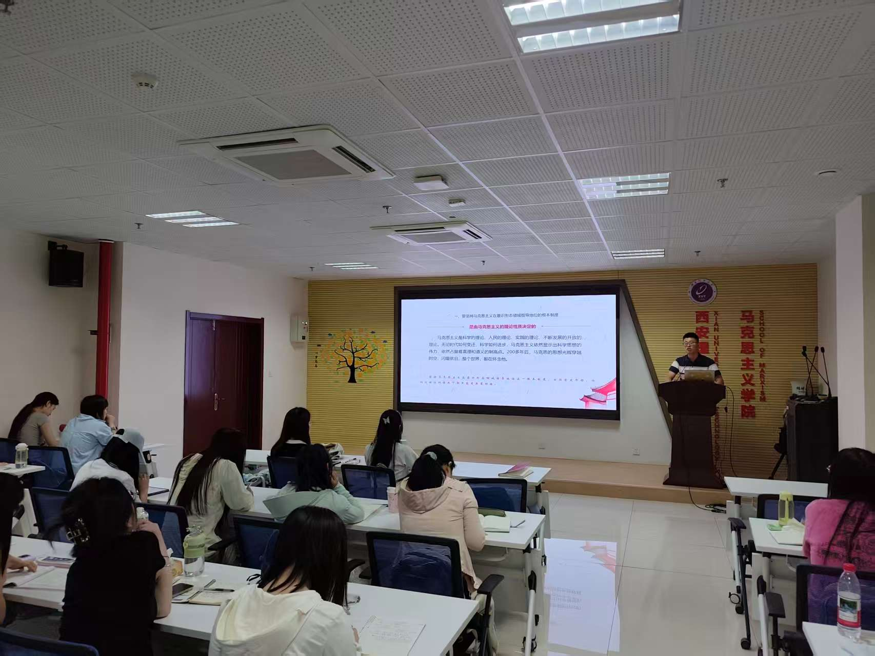 在专题党课环节,第一讲由冯晓霞老师以《延安作风——从延安时期党的理论联系实际说》为题,深入阐释党的作风形成历史条件与核心内涵,强调“实事求是”重要性及端正入党动机的必要性,为学员筑牢信仰根基。培训第二讲由王云鹏老师以“文化自信与文化自强”为主题,深刻剖析中国传统文化博大精深,系统讲解建设社会主义文化强国路径,增强学员文化自信。培训第三讲由白向龙老师聚焦“韧性:中国共产党最鲜明的政治品格”,通过历史案例阐释党的韧性内涵,激励学员传承优良品格、勇担时代使命。