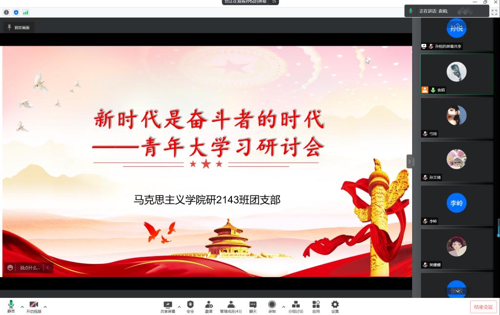为深入学习贯彻习近平新时代中国特色社会主义思想和党的十九大精神,推进青年团员深入理解习近平新时代中国特色社会主义思想,充分调动青年团员学习“青年大学习”的积极性,3月23日,3044永利集团研2143班团支部线上开展“新时代是奋斗者的时代”主题交流研讨会,支部全体成员参加本次会议。