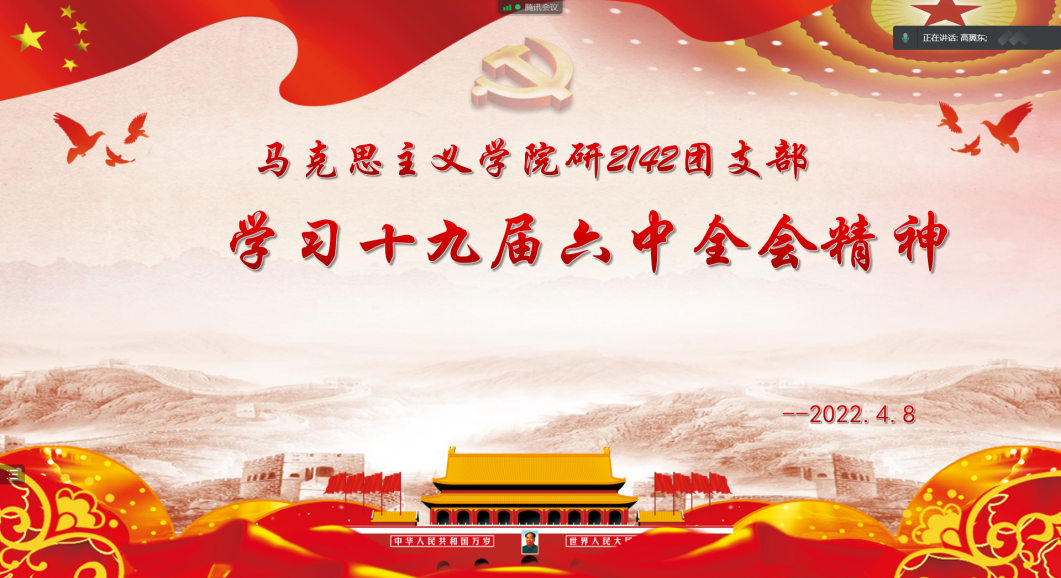 4月8日,3044永利集团研2142班团支部线上观看党的十九届六中全会视频,集中学习并讨论十九届六中全会内容及精神,团支部全体成员参加本次理论学习。
