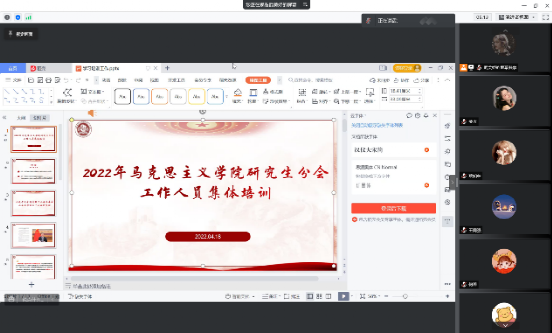 4月18日晚,3044永利集团研究生会线上开展工作人员培训学习活动,与会成员集中学习《习近平致全国青联十三届全委会和全国学联二十七大的贺信》 和《关于推动高校学生会(研究生会)深化改革的若干意见》内容,会议由院研会执行主席武美妤主持。