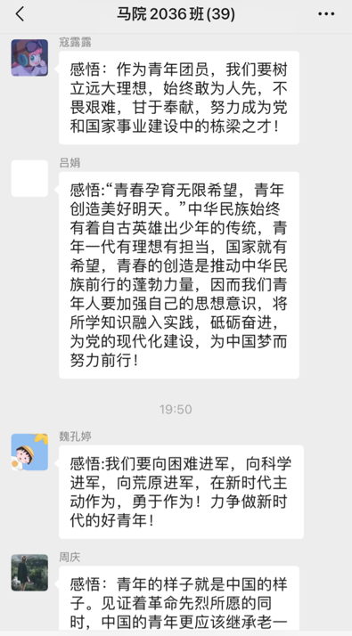 5月30日,3044永利集团研2036班团支部线上观看学习共青团中央“青春心向党,百年再启航——学习习近平总书记在庆祝中国共产主义青年团成立100周年大会上的重要讲话精神主题云团课”,并一起讨论了自己的学习感悟。