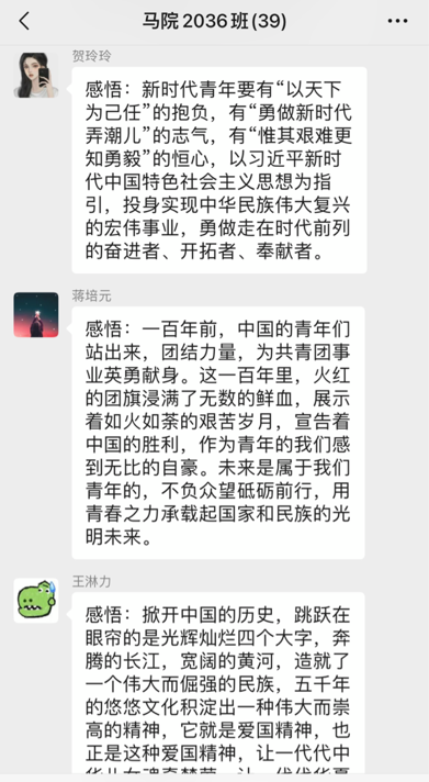 云团课观看结束之后,一些同学根据自己的学习感悟进行了分享发言。陈慧芬认为,在过去的一百年里,共青团坚定不移听党话、跟党走,发扬“党有号召、团有行动”的优良传统,为党争取青年人心,汇聚青年力量,在各个历史时期作出了积极贡献、发挥了重要作用。当代中国青年生逢盛世,肩负重任,身处中华民族发展的最好时期,把理想追求融入党和国家事业,方能不负韶华、不负时代、不负人民。
