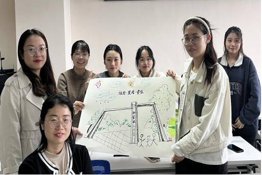 最后,各组以“我爱我的校园”为主题自由创作。学生以小组为单位在白纸上绘画自己心中的学校,不同颜色的彩笔也象征着每位同学所留意到的学校独特的风景与特点,而这些不同的风景和特点最终都汇聚成一幅完整而又感人的画作。各小组派出主创人员为大家讲述画作中所呈现的内容与其中的故事,学生的讲述展现了同学们对于新家庭、新环境的认可与接纳。本环节引导团体成员主动适应、接纳、肯定新的环境,增进了大家对校园的感情。