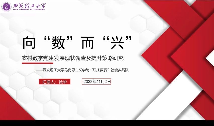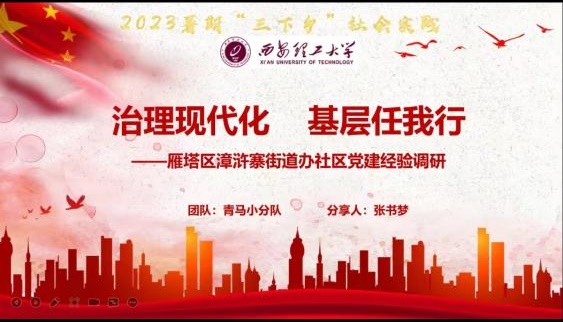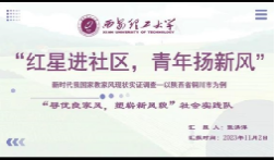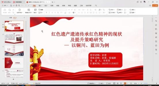 随后,我院今年组队的8支团队代表张书梦、封紫阳等同学分别以《以红色遗产遗迹为依托传承红色精神-以陕西省铜川市、蓝田县等地为例》《新时代我国家教家风现状时政调查-以陕西省铜川市为例》《陕西长征文物保护与利用》《红色文化赋能乡村文旅智慧发展》《书香润童心-将农家书屋打造成儿童的“精神乐园”》《向“数”而“兴”:农村数字党建发展现状调查及提升策略研究》《基层治理现代化视角下社区党建治理模式与经验研究-基于雁塔区漳浒寨街道办社区研究》等为题,从选题立意、实践过程和报告撰写、心得体会等四个方面进行了详细的介绍。