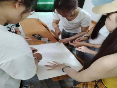 随后,“妙笔生花”将活动引向高潮。活动要求各小组成员共同用绳子连接起画笔,牵引着画笔自由作画。各团队充分发挥创意描绘出了他们自己心目中的“蓝图”,并以小组为单位上台给在场的学生解释自己团队的创作理念和对生活的美好愿景。通过游戏的方式,学生的团体意识和集体归属感进一步增强。