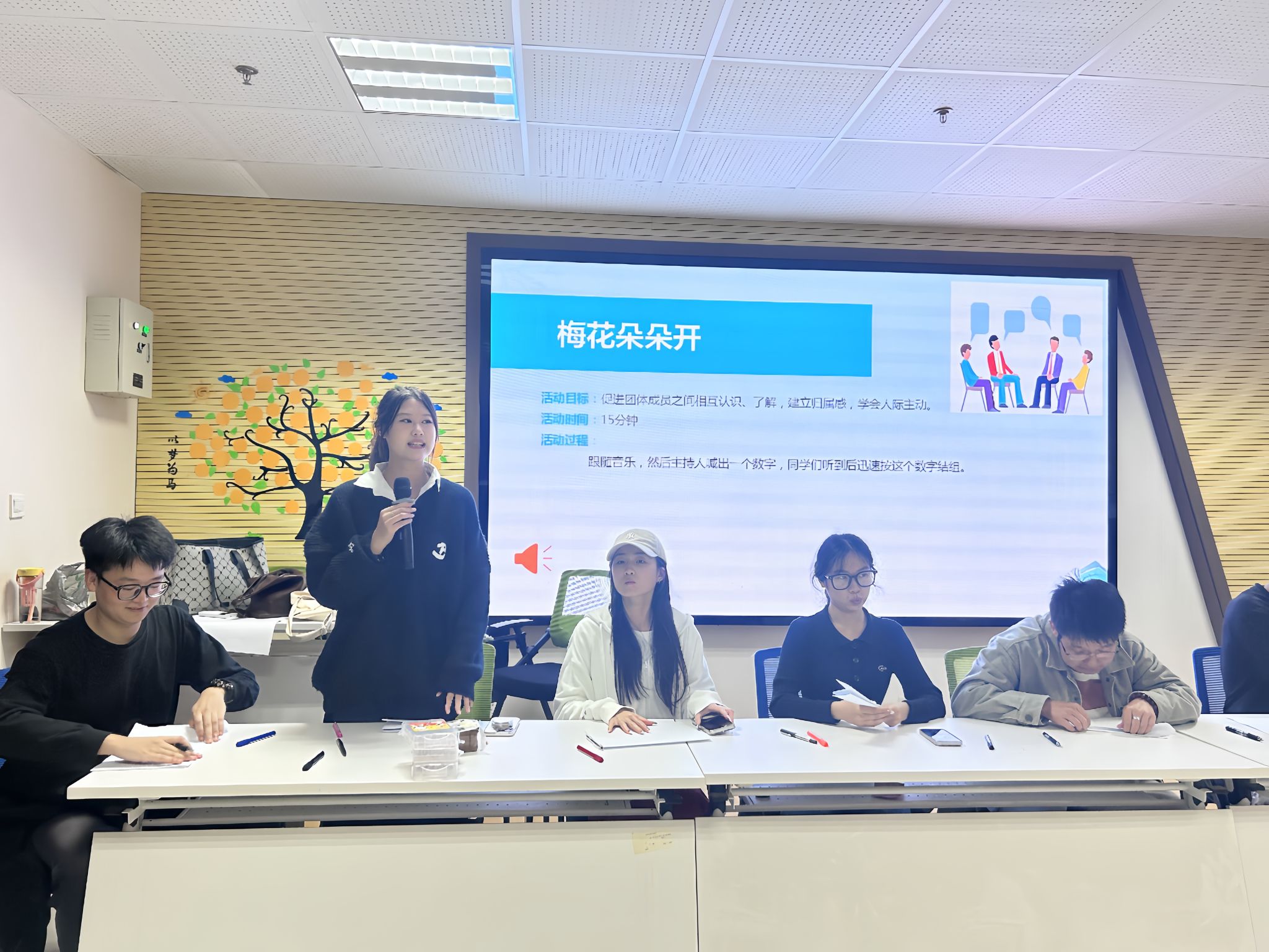 在同学们的期待中,“梅花花朵朵开”暖身活动拉开了本次团体心理辅导的序幕,同学们跟随音乐步伐,听着主持人给出的数字,迅速组队。之后进行了随机分组,大家共同思考本组队队名,口号和队伍展示造型,不仅锻炼了快速反应能力,更在欢笑中拉近了彼此的距离。紧接着,“滚雪球”的挑战,各小组成员围成一个圆圈,分别介绍自己的姓名、家乡和喜好,各组交流结束后,再派出一名代表,向全班同学介绍自己小组成员。同学们在进一步加深了解的同时,也找到了爱好相同的伙伴。而“齐心协力”的游戏将活动气氛推向顶峰。各小组集思广益、共同攻克难关,展现了集体的智慧与力量,进一步强化了团队凝聚力和归属感。