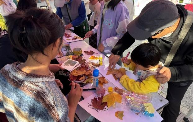 贴画活动为本次活动增添了许多趣味,参与创作的家长和学生根据自己的喜好选择自己心仪的贴纸和落叶进行自由创作。最终在大家齐心协力之下完成了一幅幅红色爱国作品。最后,大家通过展示介绍作品,表达自己对祖国的热爱之情。