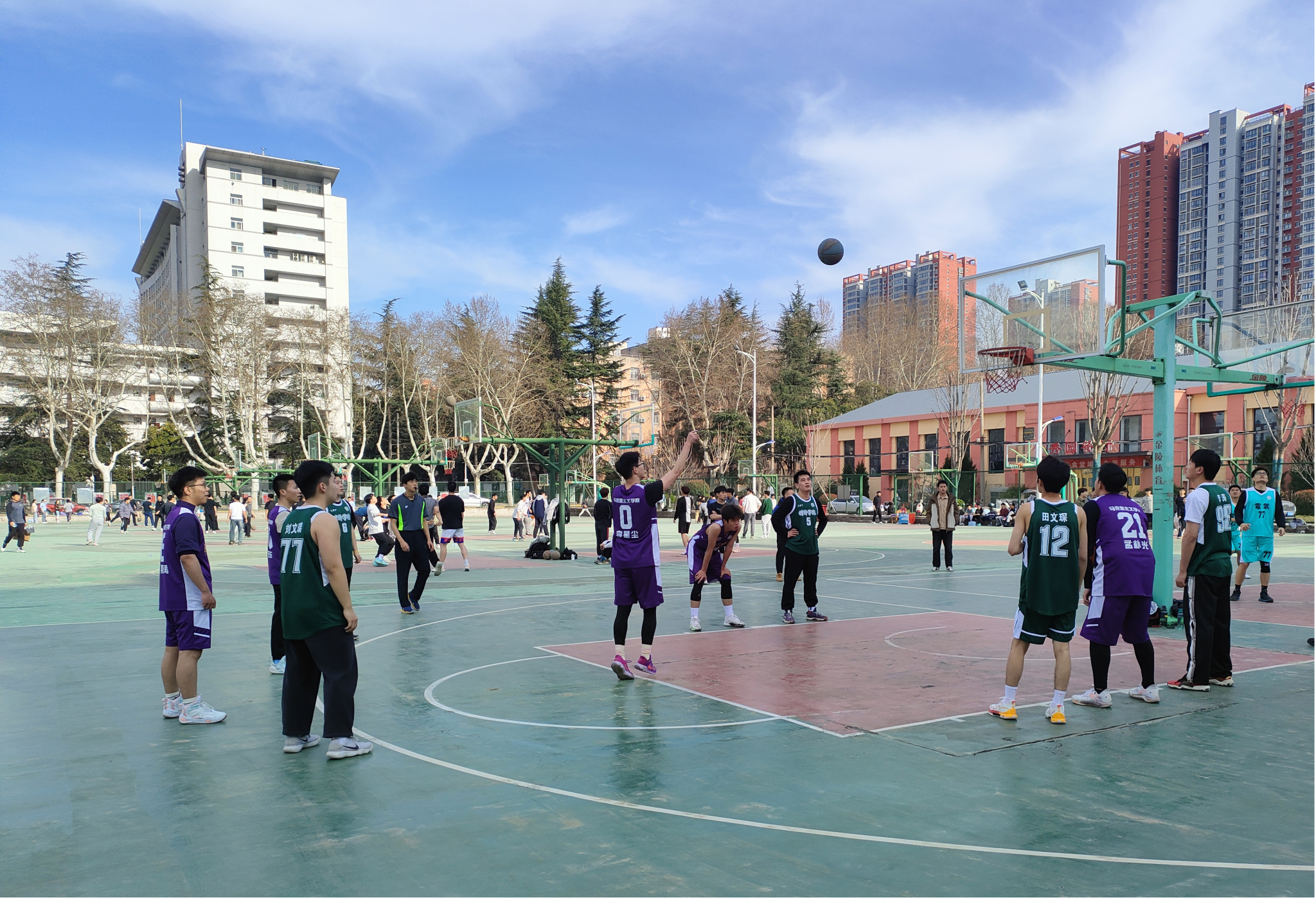 篮球赛场上,我院学生第一次参加校赛角逐,学院为队员统一购买队服,各位球员们也都精神饱满,全力以赴。带球,运球,投篮!他们潇洒的动作引起拉拉队员们的围观与喝彩!