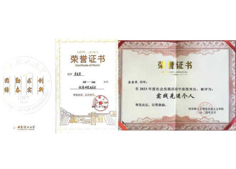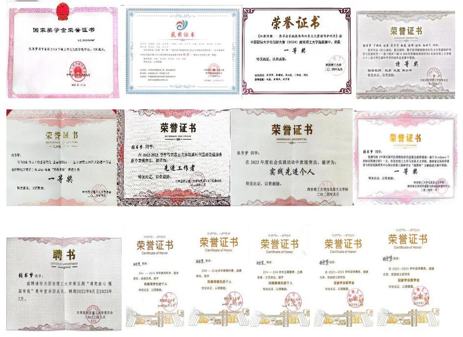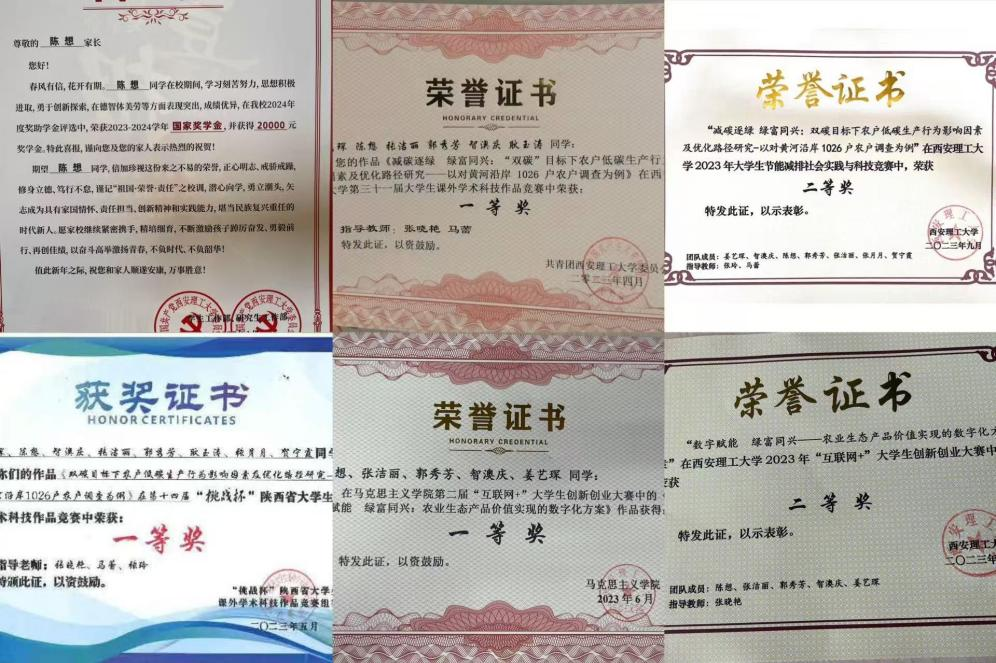 在实践方面,他积极参与各类学术科研竞赛与创新创业大赛。在第十四届“挑战杯”陕西省大学生课外学术科技作品竞赛中,表现优异,荣获省级一等奖。此外,还参与了中国国际“互联网+”大学生创新创业大赛、2022年陕西省巩固脱贫成果后评估项目、2023年大学生节能减排社会实践与科技竞赛等。他热心志愿服务,常到校史馆、市博物馆、革命公园等地参与活动,因表现突出获得社会实践先进个人称号,在服务中厚植家国情怀。