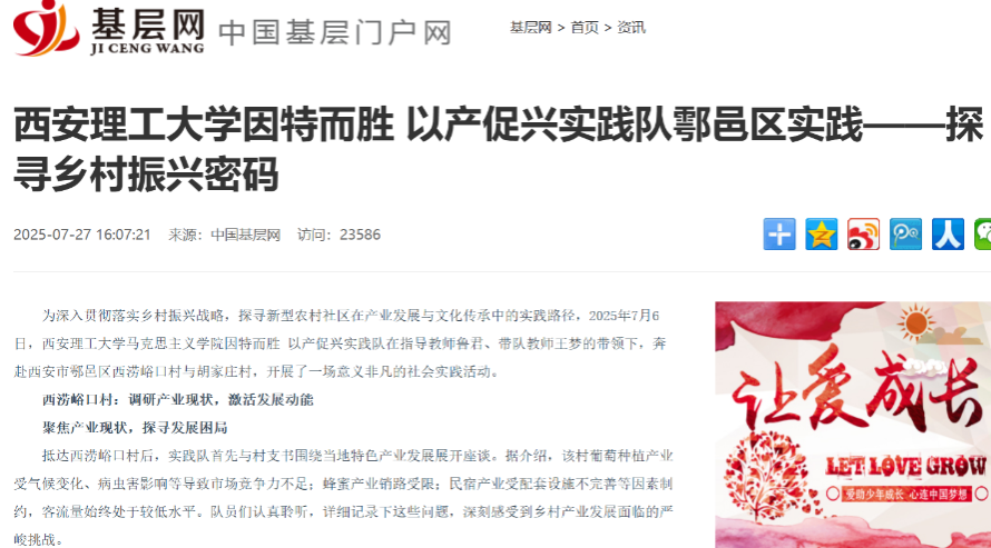 红“蕴”乡居公益服务队于2025年7月在西安市鄠邑区西涝峪口村挂牌成立基地,与该基地深度绑定,构建“需求对接—精准服务—反馈优化—迭代升级”的长效共建机制,依托乡村振兴战略需求,打造了“红色文化+产业赋能”志愿服务模式。团队深入调研村葡萄种植、蜂蜜产销等特色产业,形成《秦巴山水拓富路——鄠邑区富民特色产业发展现状调查报告》,为村民提供切实可行的产业优化方案。