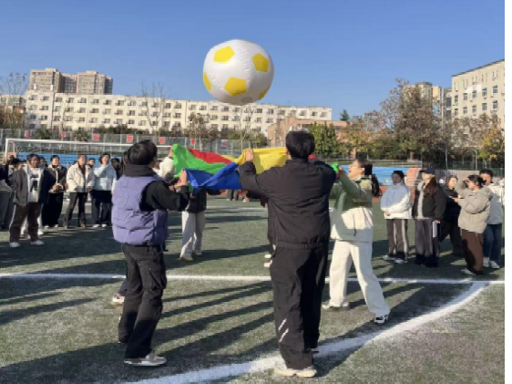 目光如炬,专注之至,齐声共力,阵阵飞舞。同学们举起手中紧握的彩虹伞,左右开弓,使得气排球来回跳动,随着颠球数的次次增加,展现出小组成员们之间的团队协作力。